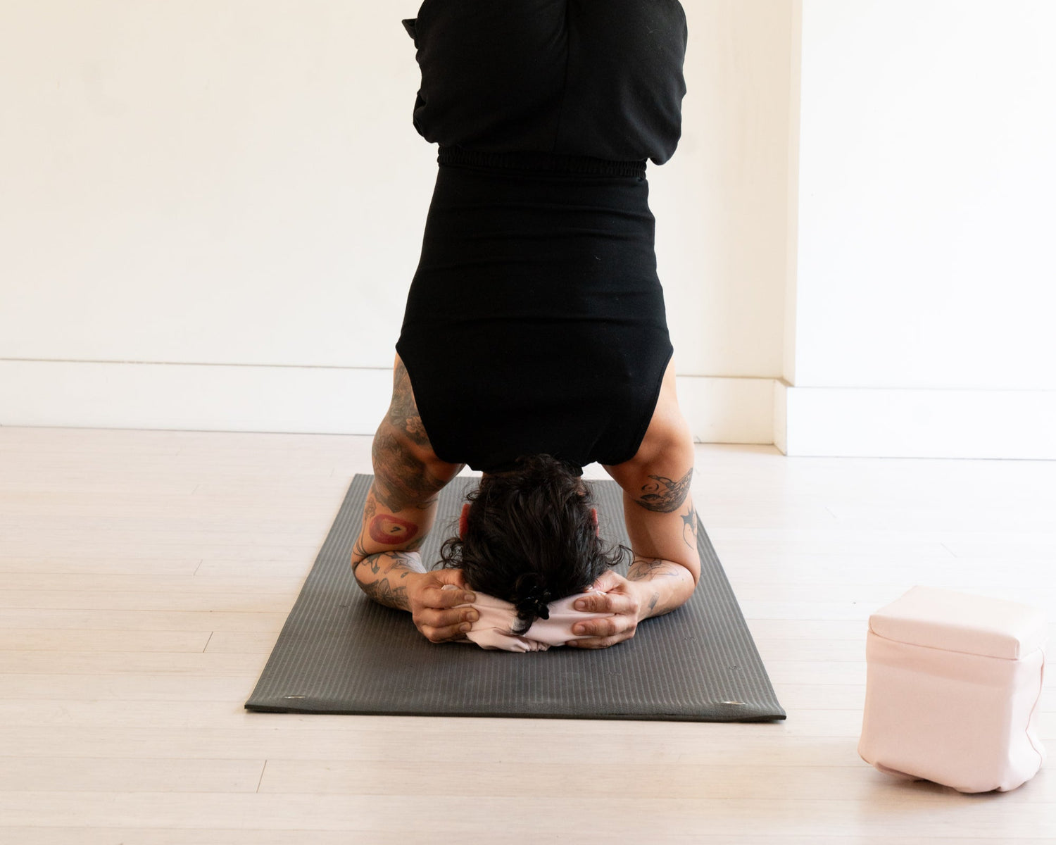 Place the crown of the head on The Yoga Pillow as a support for headstand.